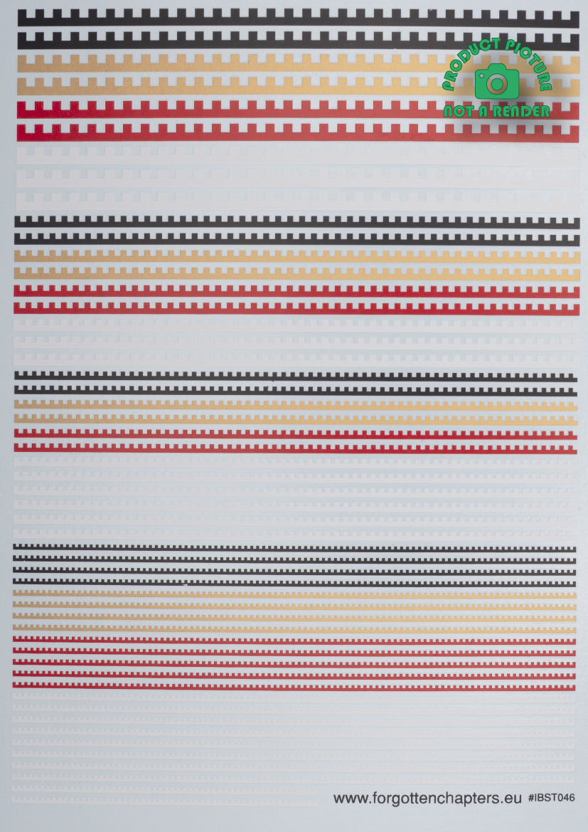High quality pre-cut waterslide transfers (decals) sized for 28 mm scale miniatures. This A6 decal sheet contains several sized cog like garment trims ideal for your space toaster armies.