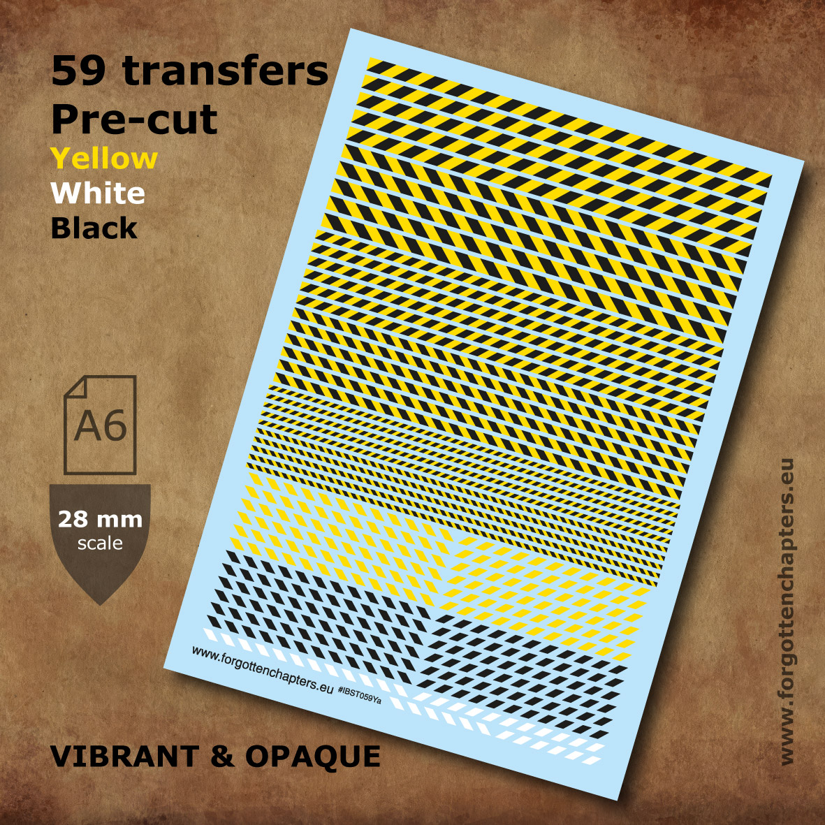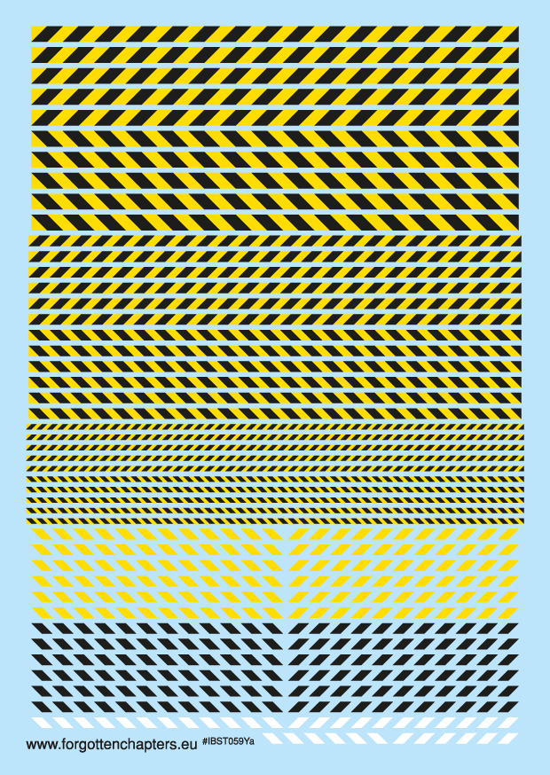 High quality pre-cut waterslide transfers (decals) sized for 28 mm scale miniatures. This A6 sheet focus on yellow hazard stripes and contains 59 individual transfers printed in solid white, black and yellow. Colours are bright and can be applied over the darkest background.