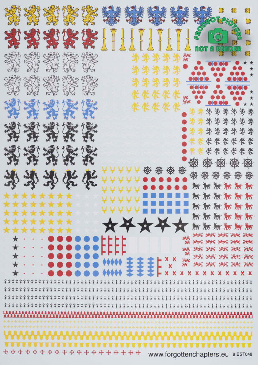 High quality pre-cut waterslide transfers (decals) sized for 28 mm scale miniatures with heraldic charges used by the Englishman at Battle of Agincourt. This A6 sheet contains 513 individual transfers and can be used to make at least 1 shield and 1 barded horse of each of the 40 coat of arms shown in the reference picture. The transfers are printed in solid red, yellow, blue, white and black that can be applied over the darkest background. The several different sizes allows flexibility to perfectly fit in shields and horse bards across different miniature brands and game systems.