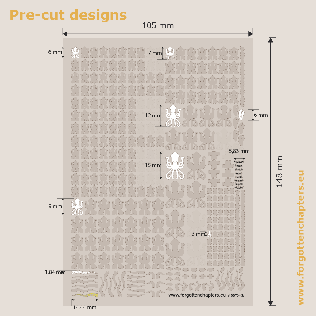 High quality pre-cut waterslide transfers (decals) sized for 28 mm scale miniatures. This A6 sheet contains 329 individual transfers printed in solid white, black and gold. Colors are bright and can be applied over the darkest background.