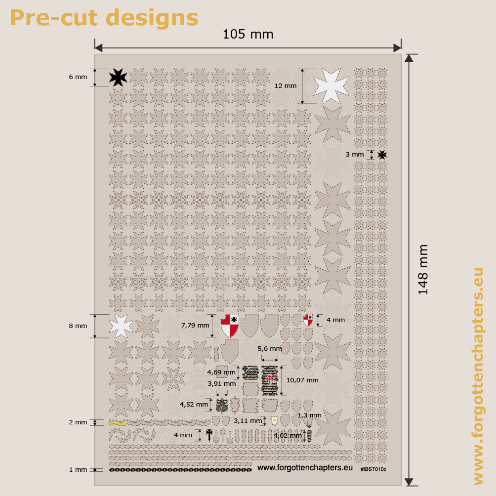 High quality pre-cut waterslide transfers (decals) sized for 28 mm scale miniatures. This A6 sheet contains 329 individual transfers printed in solid white, black, red and gold. Colours are bright and can be applied over the darkest background.